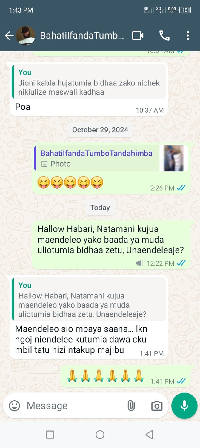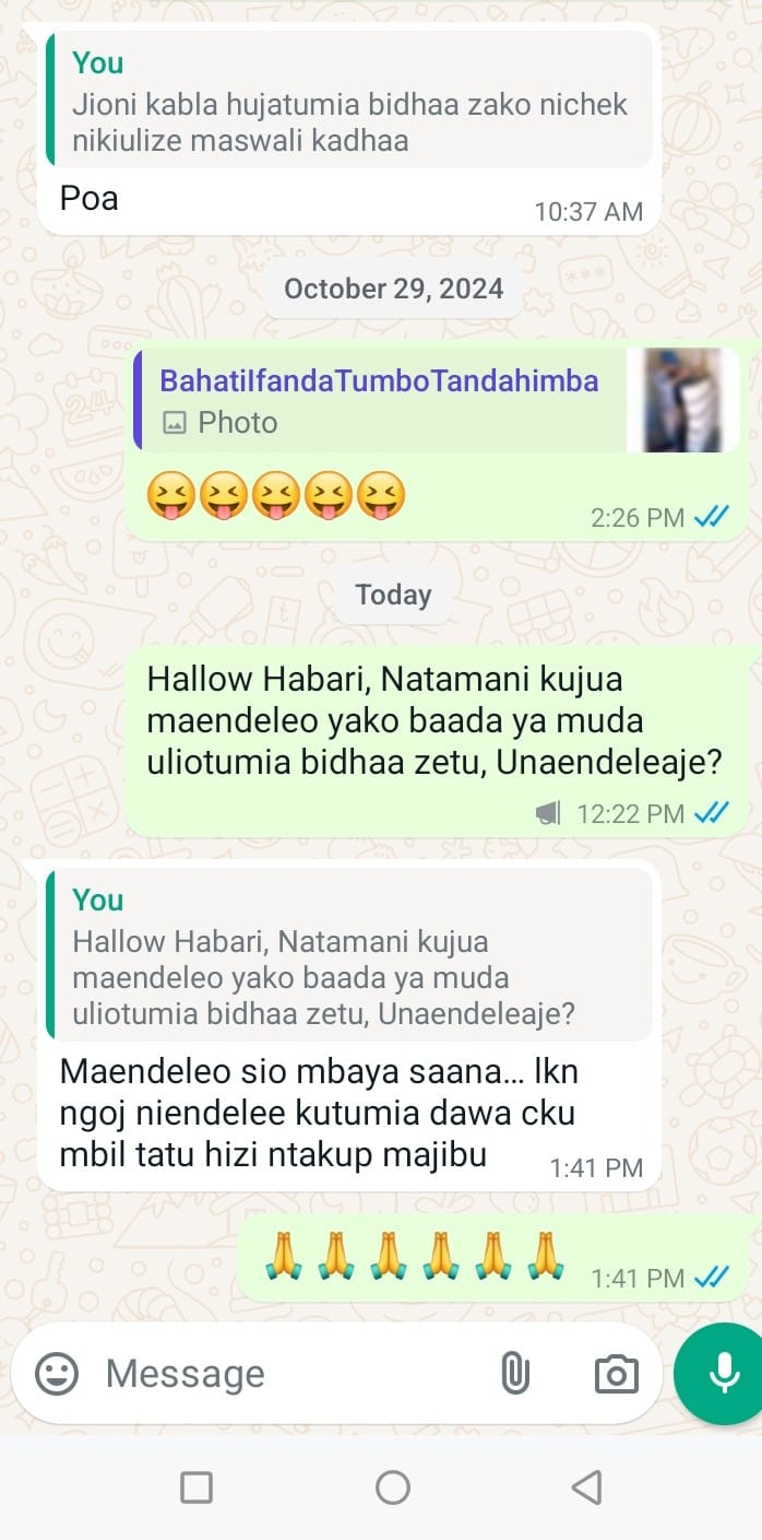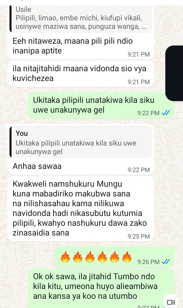 Kitu ninachofurahia zaidi ni kuona siumwi umwi mara kwa mara kama ilivyokuwa zamani kabla sijatumia dawa hizi zilizoniponesha…