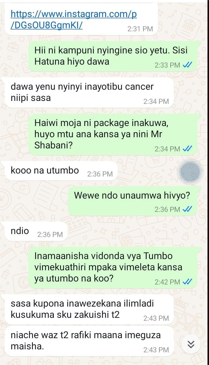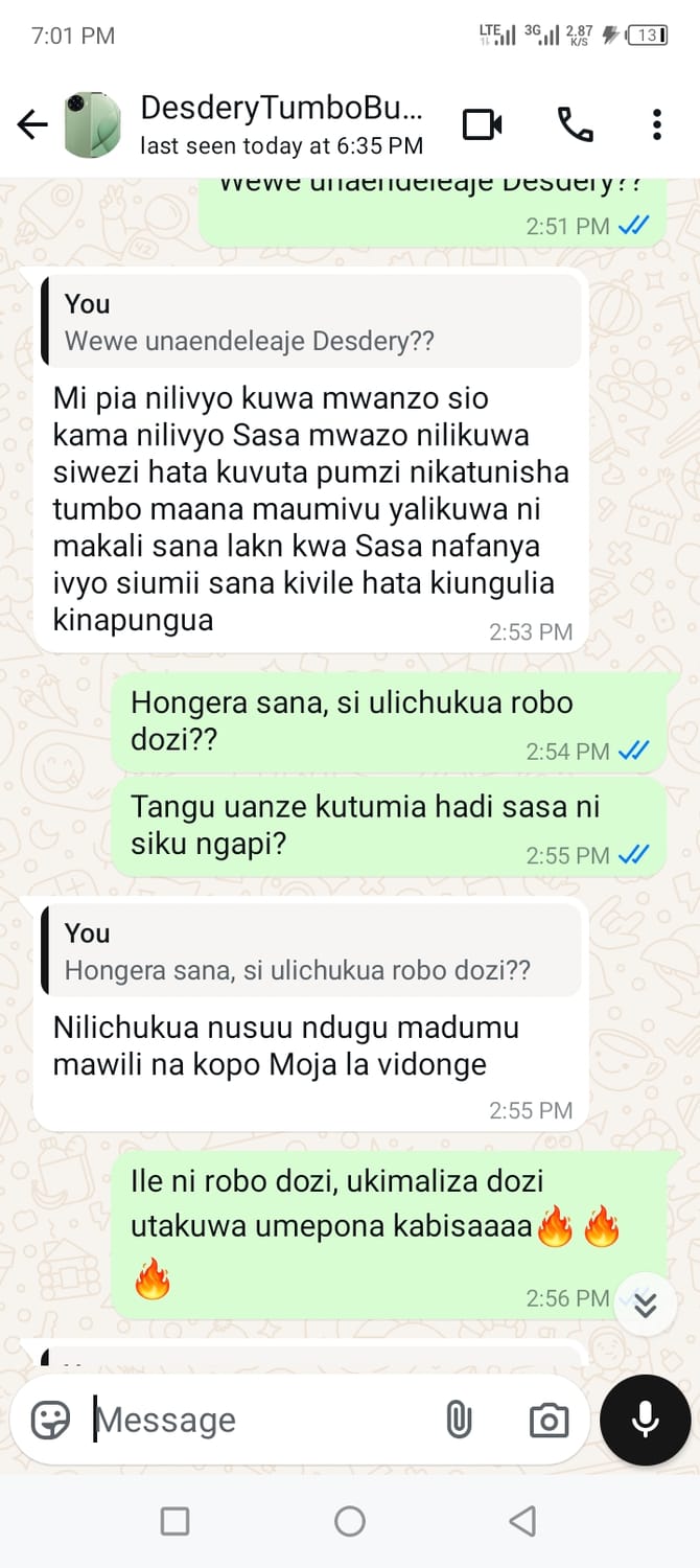 Nikamuuliza vinauzwaje? akanielekeza virutubisho vitavyofaa kumaliza tatizo langu, kwenye bei sasa nikaona hasara…