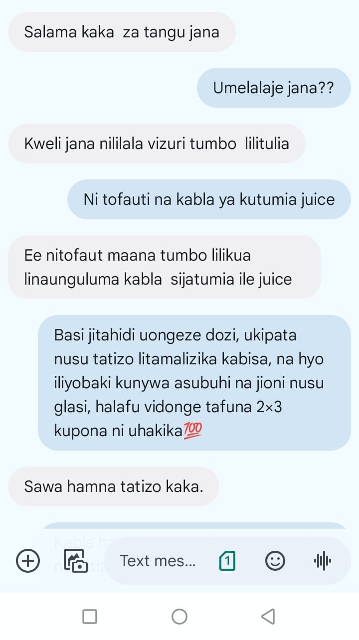 Asubuhi tu nikampigia simu rafiki yangu nikamuliza hivi ile dozi kamili ya kupona vidonda vya tumbo ni shilingi ngapi? Akanitajia bei nikamtumia pesa...